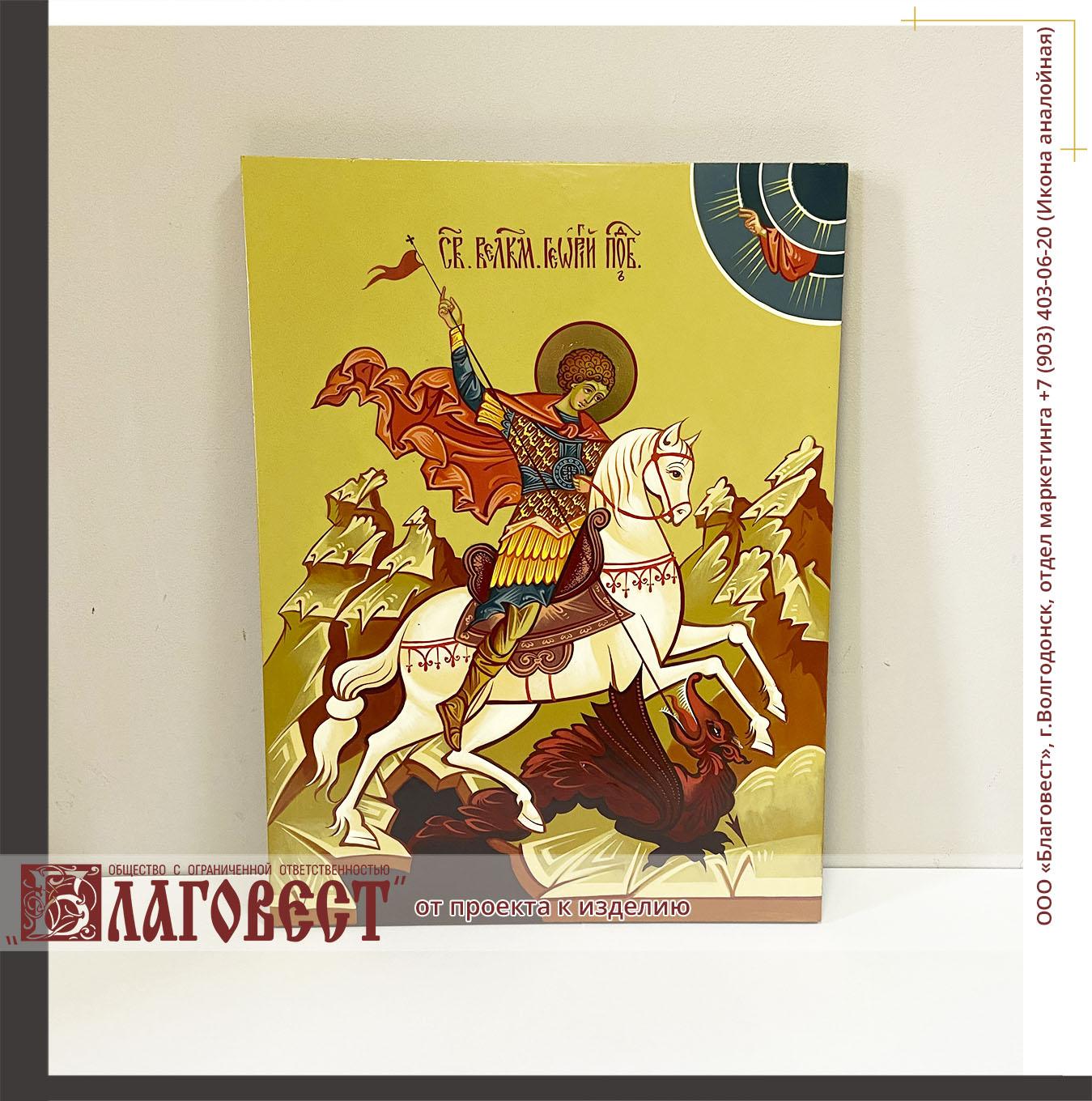 Образ"Святого великомученика Георгия Победоносца" написан темперой по левкасу на основе из МДФ в древнерусском стиле. Нимб с покрытием поталью.