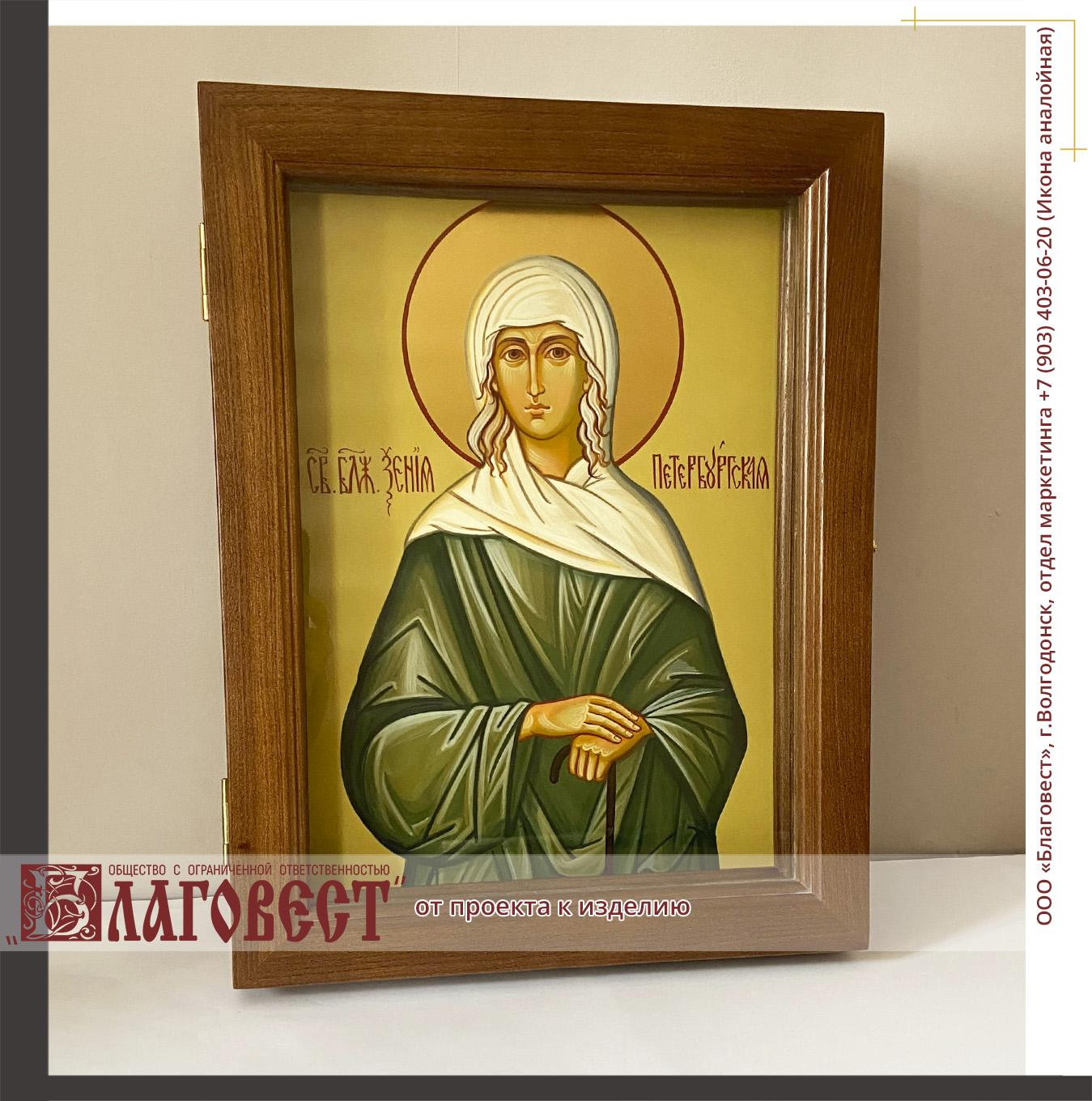 Икона "Святая блаженная Ксения Петербургская" в деревянном киоте со стеклом написана на МДФ темперой по левкасу в древнерусском стиле. Нимбы с покрытием поталью.
