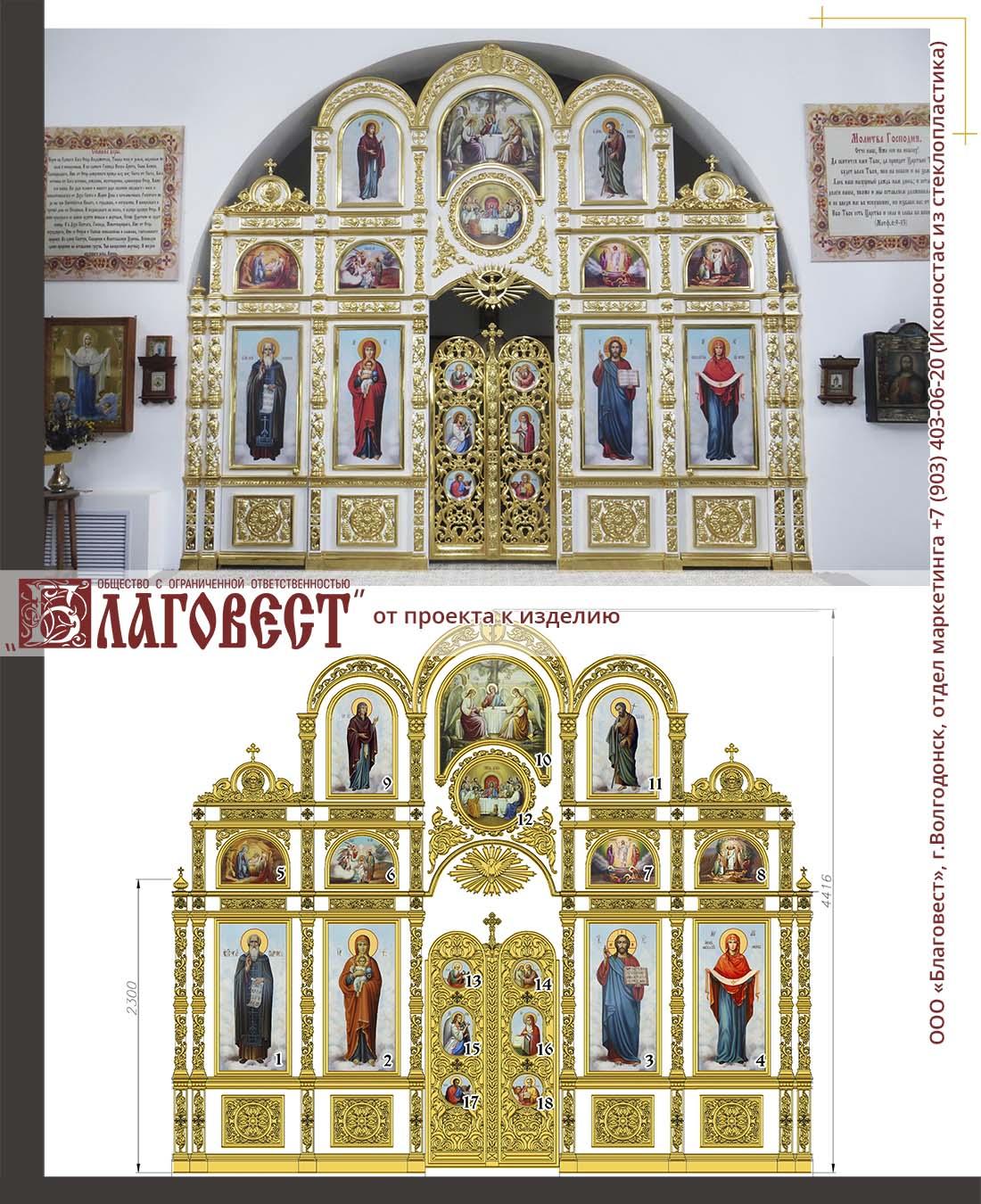 Для храма в Краснодарском крае мы изготовили и установили иконостас из стеклопластика. Иконостас выполнен в белом цвете и украшен резными элементами с золочёнием поталью.