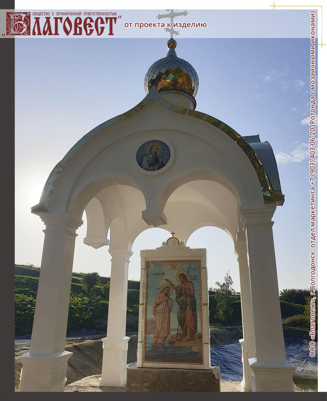 Кроме этого, был изготовлен стеклопластиковый напольный киот размером 3060х1660мм (ВхШ) и мозаичные иконы - Божия Матерь "Живоносный источник" и "Крещение Господне". Габаритные размеры икон - 2450х1400мм (ВхШ).