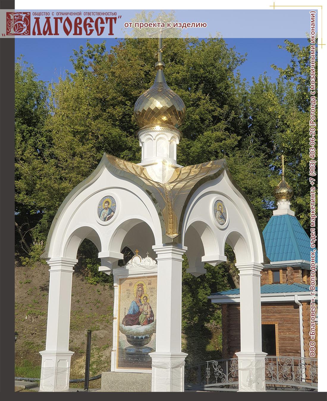 Конструкция ротонды представляет собой колонны из металлокаркаса, обшитый стеклопластиком, а также из стеклопластика изготовлена сводовая часть. Кровля - нержавеющая сталь с напылением нитридом титана TiN "под золото". Подкупольный стеклопластиковый барабан венчает главка с крестом, облицованные нержавеющей сталью с покрытием нитридом титана.
