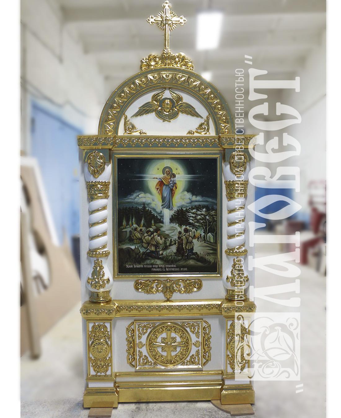 Для храма мы изготовили напольный киот из стеклопластика размером 1330*3120мм (Ш*В). Киот окрашен белой алкидной краской, а декоративные элементы покрыты поталью, благодаря чему киот мягко отражает свет и выглядит торжественно.