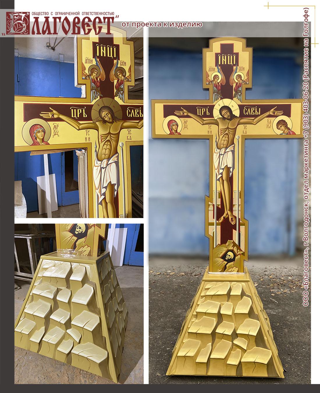 Для храма по индивидуальному проекту мы изготовили передвижное Распятие на Голгофе общей высотой 2,5 м. Изображение на кресте писаное, выполненное в древнерусском стиле, а нимбы Спасителя и Предстоящих покрыты поталью, что придаёт образам мягкое золотистое сияние.