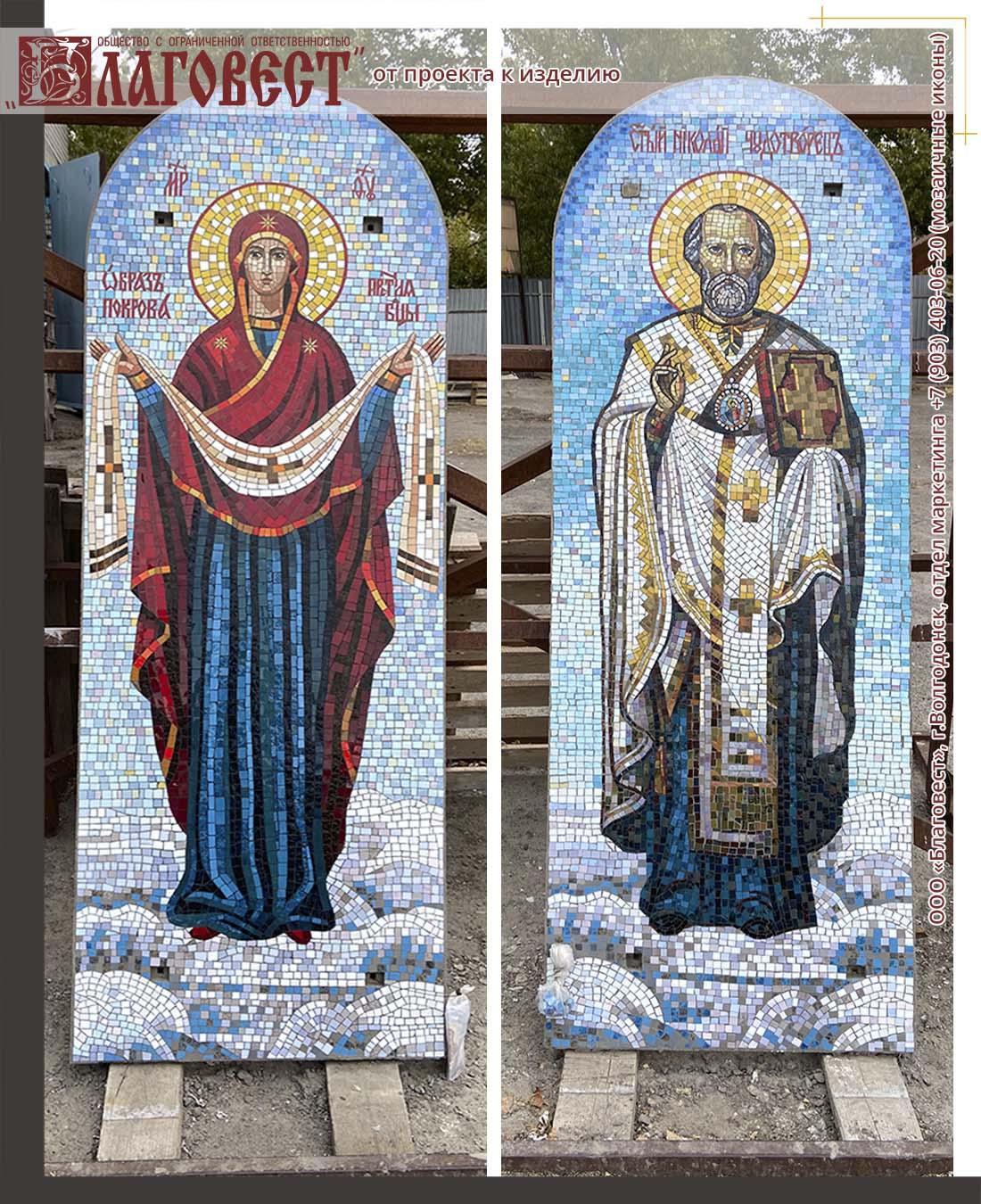 Для храма в Ростовской области, для которого мы уже изготавливали мозаичную икону, были выполнены и установлены ещё две мозаики - образ Божией Матери "Покров" и Святитель Николай Чудотворец.